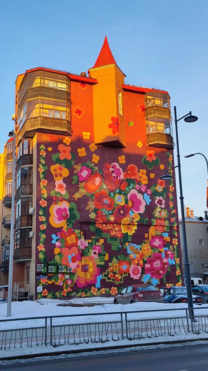 Пока друзья искали муралы в Железнодорожном, я занималась поисками муралов в Тюмени. И нашла их! Правда, они были разбросаны по всему городу, а не сосредоточены в одном месте. Зато удалось изучить не только центральные улицы Тюмени, но и все дворики и закаулки. Все муралы выполнены в рамках проекта "Морфология улиц", который проводится с 2017 года. В 2017 году в Тюмени впервые прошел фестиваль для уличных художников «Морфология улиц». Его организовали художник Дмитрий Зеленин, сообщество «Цвет города» и команда мультицентра «Моя территория». В тот год организаторы получили 70 заявок от художников, из которых отобрали 28 человек из Тюмени, Екатеринбурга, Кургана и Кирова. Так, в городе появилось 32 стрит-арта. Сначала муралы были небольшие. Но по итогам фестиваля "Морфология улиц" в 2019 году в Тюмени появилось 25 стрит-артов: 9 больших, 14 малых и 2 от экспертов. В 2020 году "Морфология улиц" стала всероссийской. В итоге за лето на улицах Тюмени появилось 13 новых работ и обновленный а