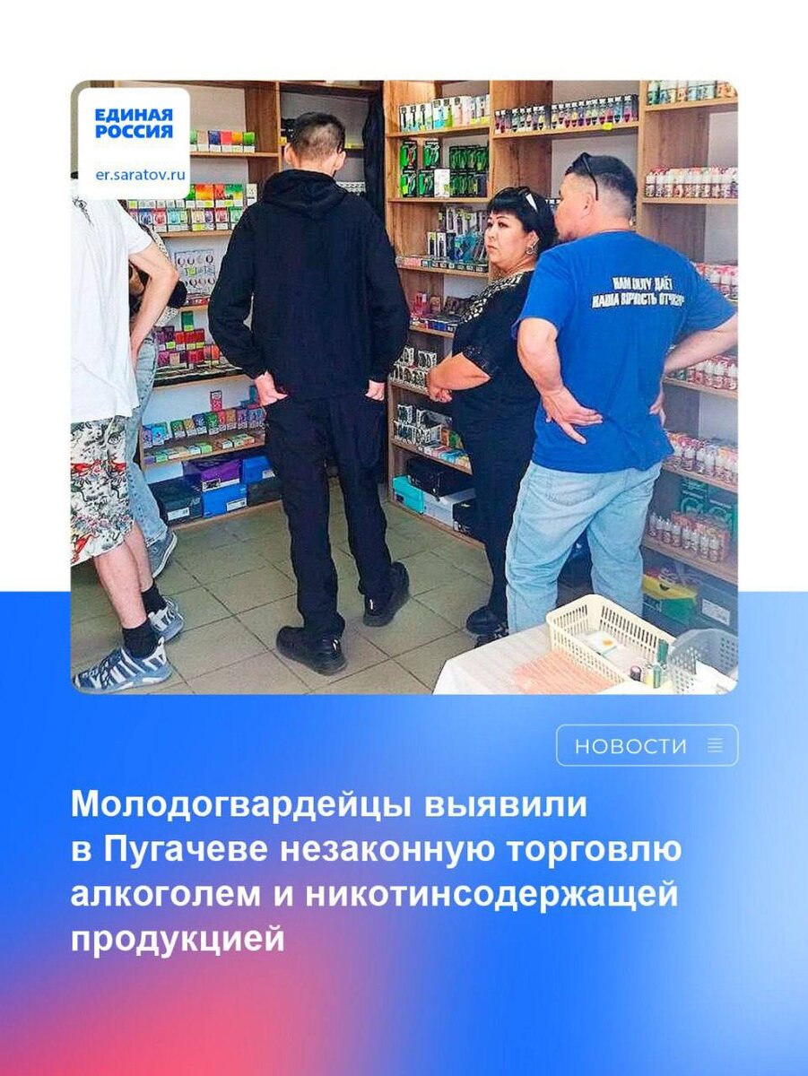 ✅Саратовские молодогвардейцы провели выездной рейд совместно с Пугачевским отделением «Единой России» по местам незаконной торговли алкоголем и табачной продукцией. 🌆В День молодежи общественники по инициативе регионального отделения МГЕР совместно с местным отделением молодогвардейцев в Пугачёве провели рейды по местам продажи алкоголя и вейпов. Во всех магазинах волонтерам удалось приобрести крепкую алкогольную продукцию, запрещенную к продаже в праздничный день. С продавцами провели профилактические беседы и предупредили о скорейших повторных рейдах. ❌К тому же столкнулись с ситуациями грубого нарушения правил продажи никотинсодержащей продукции. Так, в поле зрения общественников попали магазины с открытой выкладкой товара, продавцами без официального трудоустройства, отсутствием обязательной маркировки на продукции и другими явными нарушениями, которые должны были устранить до 1 июня 2023 года. Самыми серьёзными нарушениями стали продажи несовершеннолетним, а также реализация з