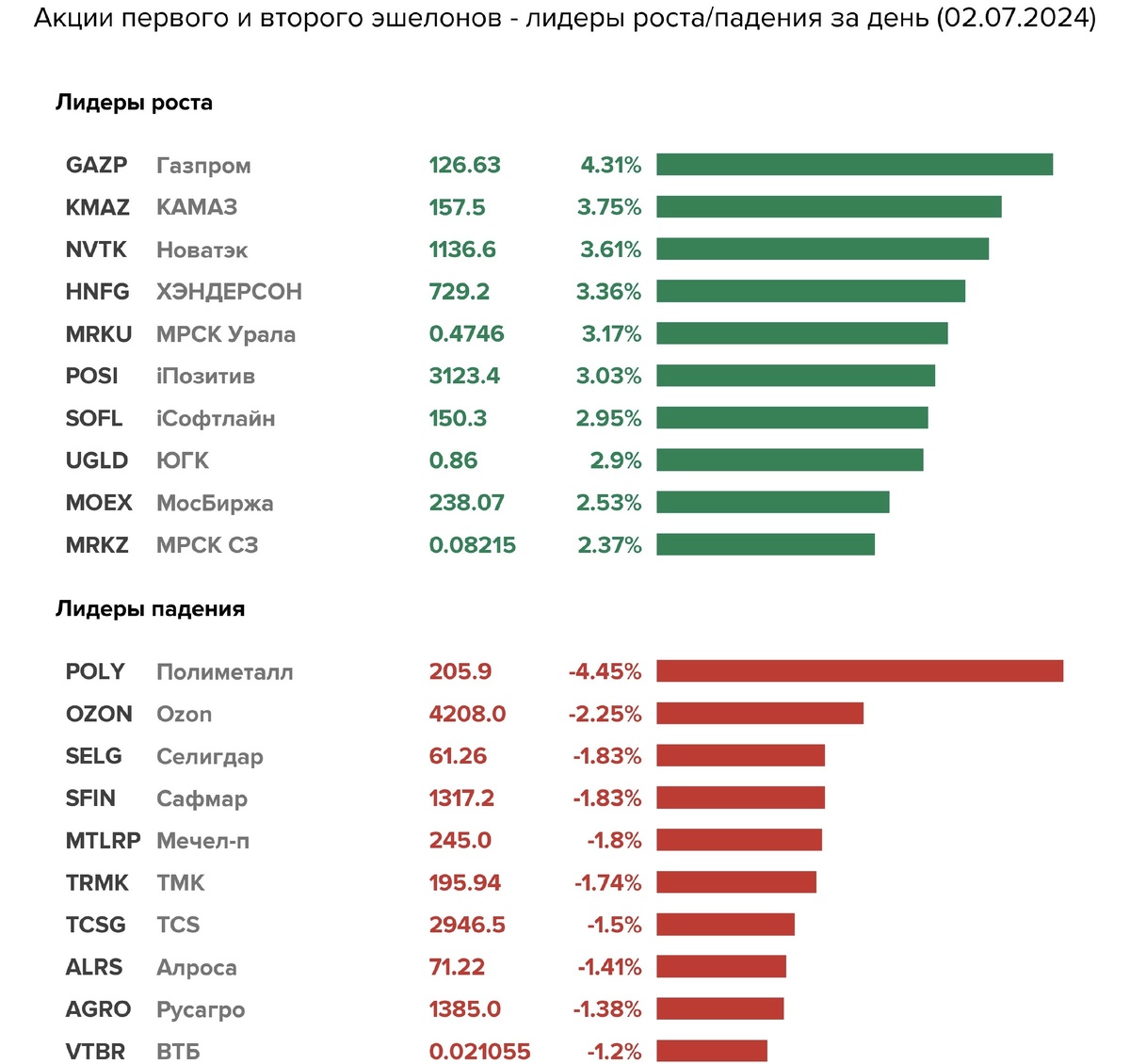 Всем привет! По итогам основной сессии 2 июля индекс Московской биржи прибавил 0,9%. Второй день на этой неделе индекс тянут Газпром и Новатэк. Уже жаба начинает квакать о том, что надо было в Газпроме позицию на исторических минимумах увеличивать, а не хлопать ушами. Новатэк можно было бы и побольше взять, так как позиция небольшая. Банк России объявил курс на завтра незначительно увеличив его у доллара и юаня. Минфин завтра предложит новый выпуск ОФЗ с фиксированным купоном - 26248: Мосгорломбард отчитался о кратном росте выручки по итогам первого полугодия: Утром оформил заявку на вывод денег с по завершившемуся полису Смарт Плюс, оказалось все проще, чем я думал. Статью сделаю, чтобы показать что нужно делать. Наверное, уже завтра. Рекомендую Смарт плюс как альтернативу вкладам, в том числе из-за возможности оплатить его кредиткой (например, я оплатил со Сбера). Поставил заявки на два выпуска облигаций, которые сегодня размещались: Но с Русалом что-то пошло не так - заявка не сра