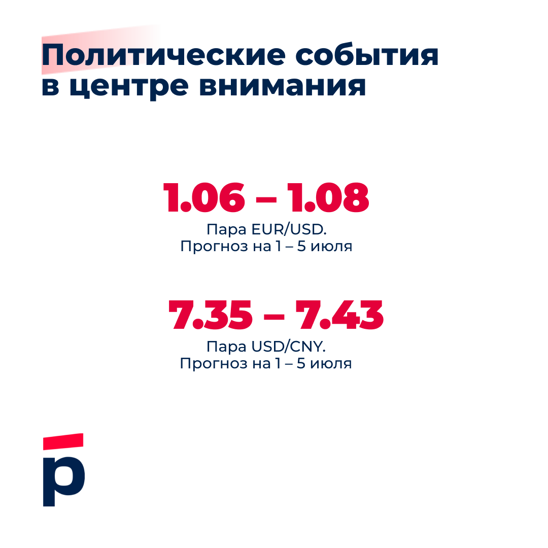 Аргументом в поддержку евро на неделе может стать переоценка политических рисков во Франции. Там в ходе парламентских выборов лидируют «правые», но им, по предварительным оценкам, не хватает голосов для формирования большинства. Также фокус будет сделан на июньских данных из ЕС по инфляции (2 июля) и из США (5 июля) по рынку труда.
