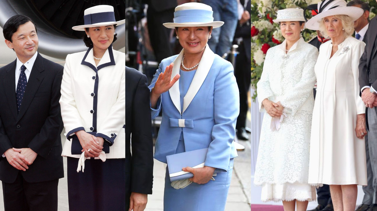 Прибыв с государственным визитом в Великобританию, императрица Масако сошла с самолета в прекрасном васильково-синем наряде с белыми акцентами. Ее сверкающее жемчужное ожерелье дополняло крупные жемчужные серьги, а белые элементы гармонировали с ансамблем. Аккуратный бантик на блейзере служил пуговицей.