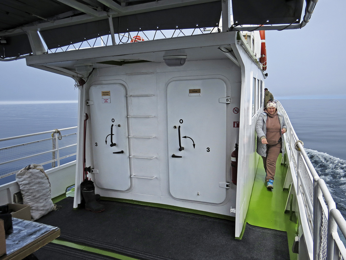 Но больше времени мы всё-таки проводили на палубе, в первый же час надев на себя всё, что смогли надеть. Вода, по которой считанные недели назад плавали льдины, прогрелась дай бог до 3-4 градусов, так что холодом с Байкала веяло что с ледников. Туман, стоило было выйти из устья Баргузин-реки, заполнил всё, и Андрей сетовал, что вообще-то по правому борту очень красиво.