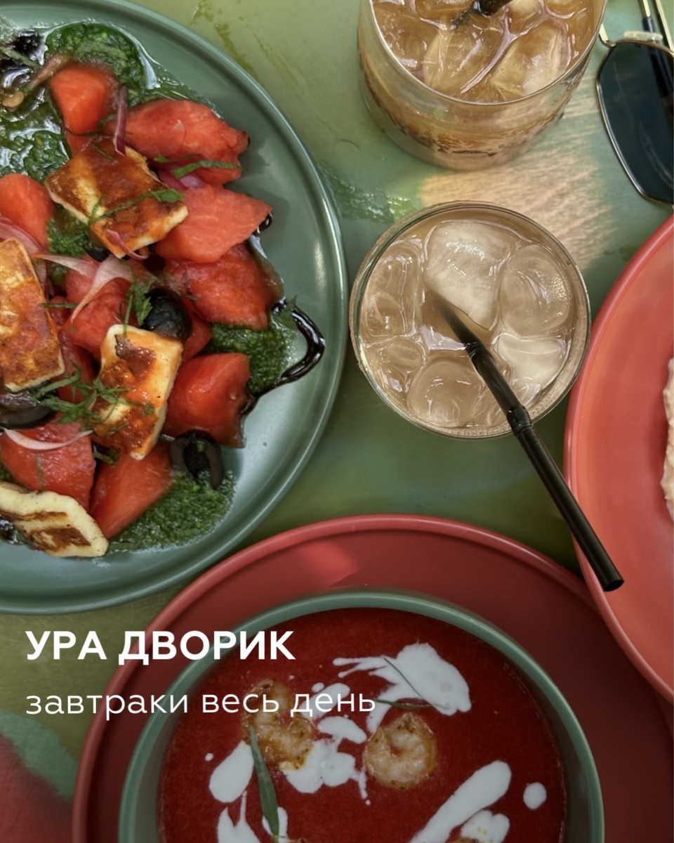 Ну что, дорогие мои! Мы уже успели затестить тусовочный дворик УРА на Газетном, 52, пора бы и завтраки (которые здесь весь день) попробовать! Поо сам дворик рассказывала пару рилсов назад, поэтому чего тянуть, начнем сразу с обслуживания! Была здесь несколько раз за последние пару недель, поэтому могу сказать, что скорость обслуживания попадалась всегда разная, вечером в будни всегда медленнее (один разок даже приходилось самим приходить к стойке, хотя посадка была далеко не полная). В меню много позиций завтраков (сладкие и соленые), салаты, закуски и даже суп) Что касается шекелей, то спешу рассказывать! 💵 Панкейки с йогуртом и черничный джемом 420 р Нежные панкейки с йогуртом, черничным джемом под покрывалом из молочного шоколада с мороженым и персиком, сверху посыпаны миндальными лепестками. Отличная сладкая позиция, при этом не кажется приторной за баланса вкусов 💵 Бриошь с арахисовой пастой, бананом и тутовником 420 р Блюда с арахисовой пастой для меня в 99% - да. Это н
