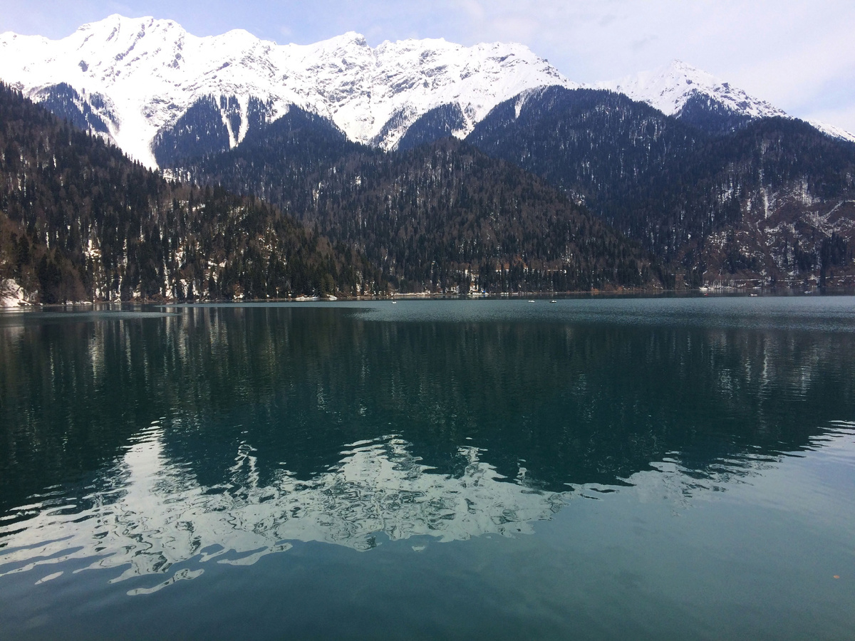 Во время отдыха в Абхазии обязательно следует побывать на озере Рица. И не потому, что это популярное и всем знакомое туристическое место, где бывали практически все туристы. Там приятная для глаз открыточная красота и настоящее умиротворение от единения с природой. Гладь озера на фоне высоких гор, достающих своими вершинами до неба, выглядит просто завораживающее! Даже не верится, что это не какая-то картинка, а настоящая красота природы, на которую можно любоваться сколько угодно. Я нисколько не пожалела, что взяла сюда экскурсию. Такую красоту нужно увидеть своими глазами! Озеро находится на высоте 950 метров над уровнем моря. Это ощущается – в горах на высоте воздух немного другой. Озеро всегда прохладное – даже летом температура не поднимается выше +10 - +17 градусов. В нем никто не купается, разве что моржи и любители экстрима. Желающие могут взять лодку или катамаран и покататься по озеру. Не стоит пренебрегать спасательными жилетами: надевайте обязательно! Глубина озера 63 - 1