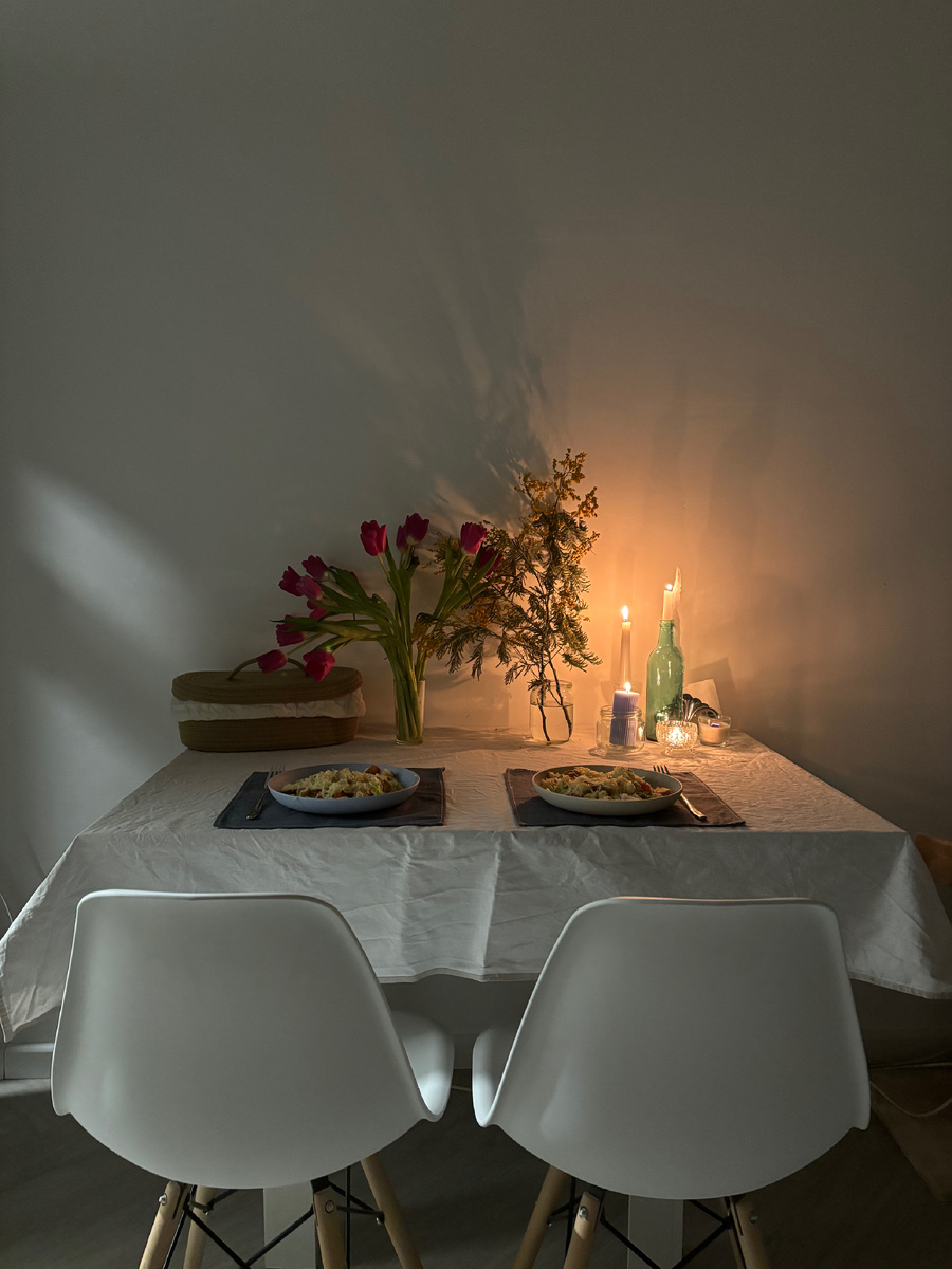 Стол у нас самый дешёвый, не мечта конечно, но я стараюсь и учусь делать так, чтобы он всегда был красивый. Учусь красиво сервировать (это оказалось сложнее, чем я думала). Поняла, что свежие цветы очень делают вид, но цветы у нас в вазе не всегда, тем более свежие. Думаю на счёт искусственных, сейчас продаётся много красивых вариантов. Купила красивую, необычную хлебницу, так как мы привыкли, что хлеб всегда на столе, но визуальный шум захотелось снизить. Свечи тоже играют роль в создании уюта, даже если их не зажигать, выглядит всё равно замечательно. Кстати, свечи я делаю сама, мне нравится и процесс и результат. Еще недавно я узнала, что есть сервировочные салфетки, а есть плэйсматы. У нас они деревянные, подходят к хлебнице и в целом к интерьеру кухни. Сейчас планирую купить красивую вазу, какую-то необычную может. Никак не попадётся мне та, которая понравится. Еще хочу несколько красивых скатертей, чтобы менять под настроение. Раньше мне было как-то неважно как выглядит стол,