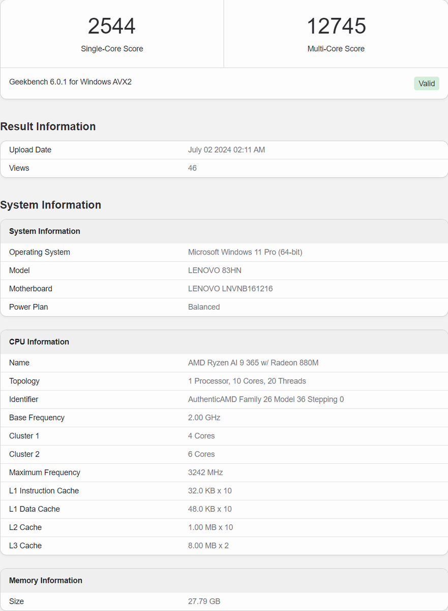 В сеть утекли результаты тестирования процессора AMD Ryzen AI 9 365 в ноутбуке Lenovo Ideapad. Тест проводился при "сбалансированном" режиме питания, но мы все равно не знаем ничего о том, с каким TDP в рамках теста работал данный процессор. Уточним, что Ryzen AI 9 365 использует 4 ядра Zen 5 и 6 ядер Zen 5c, что дает ему 20 вычислительных потоков. Что же до результатов тестирования, то они таковы: Эти результаты делают грядущую новинку на 9% более быстрым решением в сравнении с R9 8945HS в многопотоке и на 7% в однопотоке. Релиз ноутбуков с процессорами Ryzen AI 300 ожидается 28 июля текущего года.