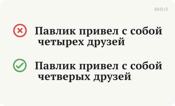 Помните, что такое собирательные числительные? А знаете, как с ними правильно обращаться? Задумывались когда-нибудь, как правильно сказать: «привел четырех друзей» или «четверых»? Ответы на все эти вопросы — внутри этой карточки. Правильно: привел четверых друзей Прежде чем узнать ответ на главный вопрос, вспомним всё, что грамотный человек должен знать про числительные. Итак, числительные бывают количественные и собирательные. Количественные — это те, которые используются для счета (один, три, восемнадцать, тридцать три). Собирательные называются собирательными, потому что объединяют несколько людей или предметов: трое друзей, семеро козлят, пятеро поэтов. Теперь к правилу. Оно короткое и понятное — в винительном падеже собирательные числительные выглядят так же, как и в родительном. Здесь напоминаем: То есть: Больше полезных карточек о русском языке — в «Грамотности» на «Меле» в Telegram. Подписывайтесь, чтобы говорить и писать правильно. Фото: Ralf Liebhold / Shutterstock / Fotodom