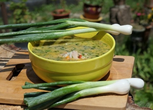 Этот куриный суп я называю «дачным» или «летним». В нем много овощей, зеленого лука и укропа. А специальная заправка делает его консистенцию неповторимо кремовой и нежной. Что касается меня, когда у меня возникает в голове какой-нибудь рецепт, я должна его приготовить. Сегодня готовить не планировала совсем, на кухне лежали вишни на варенье, не до готовки было. Но так захотелось съесть супа с куриным мясом, зелёным луком, большим количеством укропа и лёгкой кислинкой, что в конце концов, это желание победило. Я собрала в огороде зелёный лук и укроп, достала из холодильника морковь, красный перец и пастернак, нарезала все кубиками, чтобы просто бросить в кастрюлю. Обычно я кладу в куриный суп сок половинки лимона, но в этот раз лимона не было, и я вспомнила, как когда-то моя мама подкисляла борщ зелёными сливами. И я добавила вместо лимонного сока пару ложек вишнёвого сока. Я приготовила этот летний суп, съела серьёзную порцию, и наконец моя душа обрела покой. Я вспомнила слова одного ф