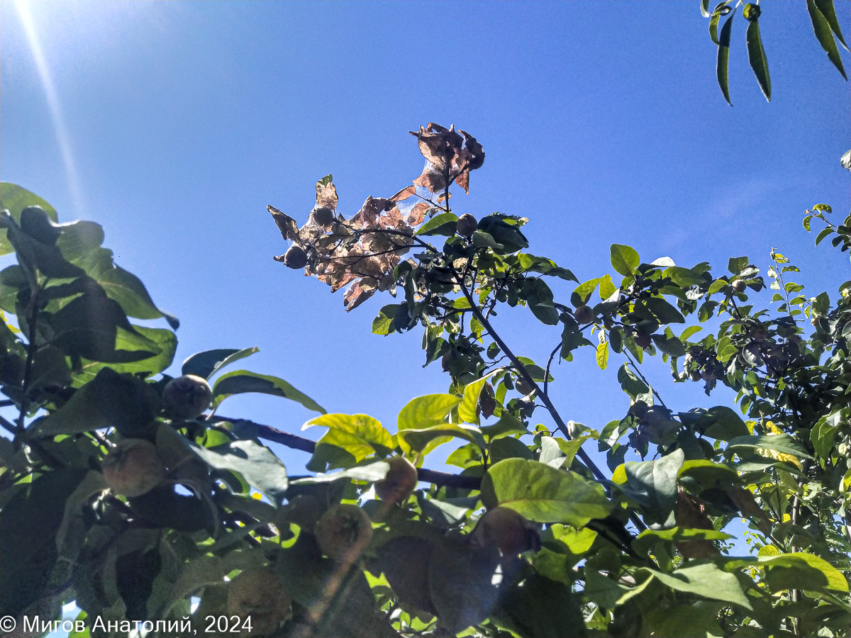 Заметил на верхушке айвы сухие листья. Сначала подумал, что это солнечный ожёг. Солнце в этом году злое, влажность низкая, трава и листья горят, поливаем сад-огород чуть ли не каждый день. Однако присмотрелся и заметил на поражённых листьях паутину. Поставил стремянку, добрался до верхушки дерева. Ага, худшие подозрения подтвердились. Никакой это не ожог. Это работа бабочки-огнёвки. Точнее, её гусеницы. Вот здесь на снимке (внизу) в верхней части, по центру, видно эту гусеницу. Сидит там, жрёт листья и плетёт паутину. Мы с этой бедой хорошо знакомы. В первый же год нашей жизни в Старом Крыму, весной 2016 г., приобрели в питомнике четыре кустика самшита. Посадили их по углам открытой террасы. Самшит растёт медленно, но мы и не спешили, ждали, когда можно будет формировать наши кустики в виде шариков. Но уже через два года прилетела бабочка-огнёвка, отложила яйца, и мы в один не очень прекрасный день обнаружили, что на наших самшитах вовсю резвятся зелёные гусеницы. Гусеницы шустрые и оч