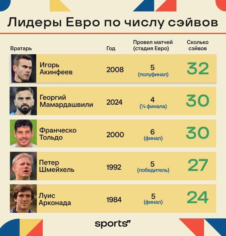 Сверкал в 22 года. Георгий Мамардашвили тащил сборную Грузии как мог: за четыре игры сделал невероятные 30 сэйвов. Перспективный грузин не дотянул только до показателей Игоря Акинфеева на Евро-2008: у российского вратаря 32 спасения в пяти матчах (у Георгия было на игру меньше). Opta составила список самых мощных вратарских перформансов с Евро-1980. Хиддинк предвидел, что Акинфеев сверкнет на Евро-2008. Игорь любит пересматривать нарезки с того турнира Тогда Акинфеев впервые сыграл на крупном турнире сборных: в 2004-м он сидел в глубоком запасе, а на ЧМ-2006 россияне не попали. Игорю было всего 22 – он считался одним из самых талантливых вратарей Европы. В 2007-м Акинфеев получил тяжелую травму колена, пропустил полгода. Но Хиддинк предчувствовал, что Игорь зажжет: «Искренне полагаю, что он может стать одним из открытий Евро-2008. Для этого у Игоря есть все данные: он смел, уверенно чувствует себя на поле, очень грамотно руководит партнерами. Надеюсь, об игре нашего голкипера на этом ч