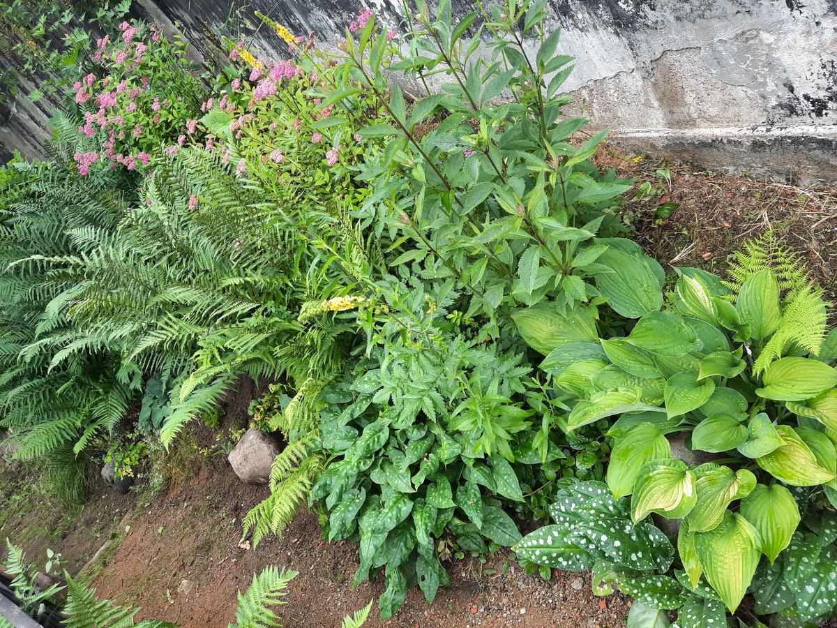 Итак, прогулки по саду всем, похоже, надоели. Прочтений маловато что-то. Так что буду рассказывать про уголочки, где изменения происходят. Сегодня на карандаш ко мне и на ковер к вам попал верхний ярус "джунглей". К этой статье я сделала небольшое видео. которое появится чуть позже. Попробовала сделать общий план. Не очень получилось, не поместилось все, так что пойдем по кругу. Итак, начинается всё это путешествие от нового "водоема". Как видите, я замульчировала почву вокруг. Под мульчей положен мокрый картон. Начинаются посадки летних растений с хосты неведомого сорта. Медуница и папоротник выросли сама. Дальше растут в тесных объятьях сразу три высоких растения. Вероника, выращенная из семян, самая простая. Растение с желтыми цветочками, название которого мне зимой даже писали. а я не выписала в запоминалку. Посконник, заметно разросшийся. Пройдемся вдоль стены. В ногах спиреи цветет садовая черноголовка. И спирея цветет. Сорт наверняка не знаю. Вот она, черноголовка, порближ