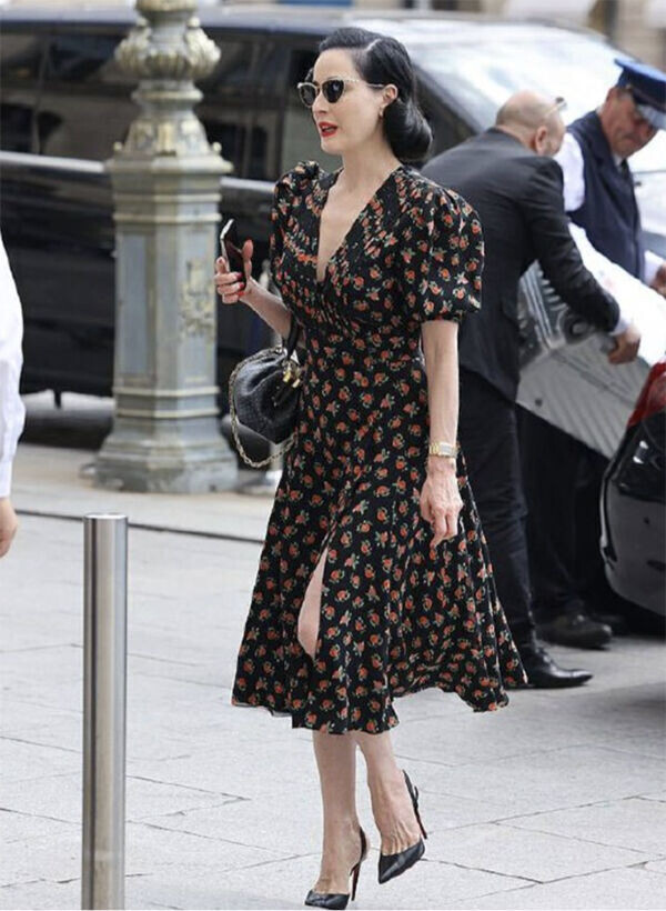 Американская актриса и певица Дита фон Тиз никогда не скрывала своего восхищения российским дизайнером Ульяной Сергеенко. Дива влюбилась в коллекции модельера, когда в 2013 году побывала на ее модном шоу в рамках Недели моды в Париже. С тех пор Дита фон Тиз регулярно появляется на публике в нарядах от модного дома Ulyana Sergeenko. Недавно папарацци сделали свежие снимки певицы. Девушка прогуливалась по улочкам Парижа в новом платье от любимого кутюрье. На Дите фон Тиз надето платье из коллекции Ulyana Sergeenko Resort. Легкое черное платье с фирменным принтом отлично подчеркивает фигуру. Зона декольте, акцент на талии, форма рукава — все отсылает нас к ретро 1920-1930-х годов. Наряд идеально дополняют красный маникюр и помада. Черные туфли и сумка также вписываются в образ. Из аксессуаров на певице только часы и солнцезащитные очки. На сайте Ulyana Sergeenko такое же платье отсутствует. Но есть изделия другого фасона с таким же фирменным принтом. Например, это платье макси с пуговицам