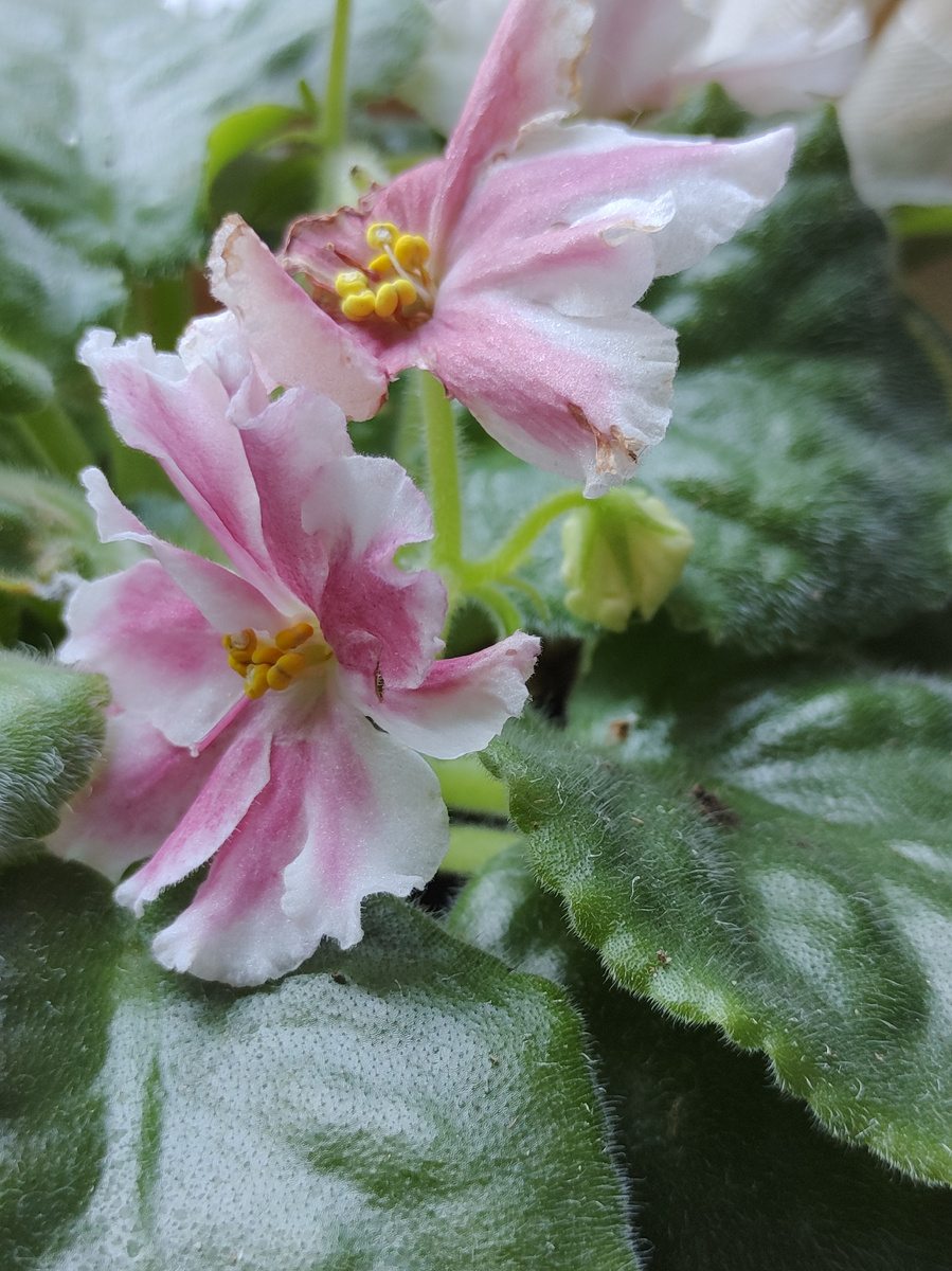 Метаморфоза. Вот такой цветонос с ярко розовым полосками получился. Остальные с небольшими розовыми пятнами, а этот прям активно розовый от центра. На солнышке видимо загорает ))) Интересно третий бутон тоже будет розовым? А ещё решила провести ее детка ))) Мелочь с цветком ))) Ещё об этой фиалке тут
