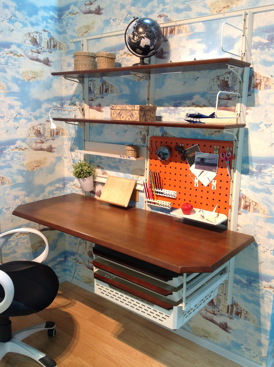 Что такое рабочее функциональное место ученика? Наличие компьютера, игр и немного книг, учебников. Если серьёзно, то место для учебы и хобби школьника должно соответствовать важным пунктам, о которых написано далее. Подвесное рабочее место со столешницей из бука с идеальной шириной 1500 мм Пространство. Если всё загромождено канцелярией, бумагами и техникой, то ученику будет дискомфортно заниматься уроками и отдыхать. Важно распределить пространство, но без правильно подобранной мебели, включая рабочий стол, стенку, это будет сделать практически невозможно. На перфорированных панелях можно размещать полезную мелочь и канцелярию, а также использовать в качестве магнитной основы Функционал. Быстро распределить вещи, получить к ним оперативный доступ – то, что нужно. Модульная мебель в этом плане является оптимальным решением. Стиль. Мебель должна выглядеть эстетично, вписываться в антураж помещения. Тогда у ребенка будет формироваться правильный вкус, что важно в жизни. Рабочее место в н