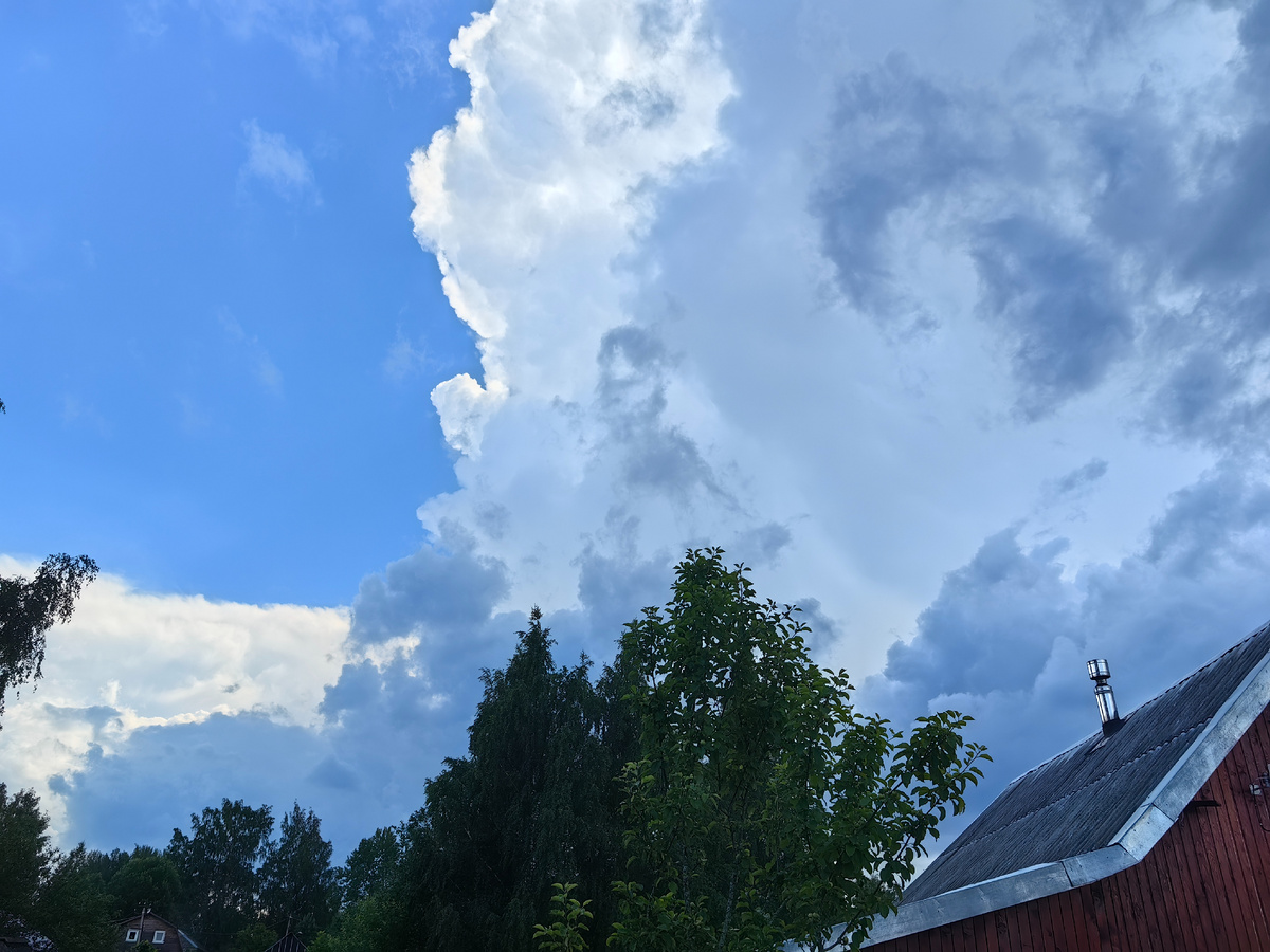 Вчера нас накрыло ливнем, он сопровождался грозой и шквалистым ветром. Вот так все красиво начиналось. А потом гром не прекращался очень долго и сверкали молнии. Минут на 10 началось светопреставление. Я только с ужасом смотрела в окно, там стеной лилась вода и гнуло деревья. А потом выключили свет. Причём вроде ветер уже сильный прошел и ничего не предвещало. Часов 5 мы сидели в тишине, без света, воды (насосы) и связи (усилитель не работал). Холодильник размораживаться начал, решили завести генератор. Муж собрал систему отлично, включаешь провод от генератора в розетку в генераторной и во всем доме свет. Тетю с дядей мы подключили через систему удлинителей и тройника. Генератор хоть старенький, но мощный. Холодильники спасли, а к вечеру позднему дали и свет. В деревне лужи, все мокрое. Герочка после прогулки сохнет. В 11 вечера пропала связь. Свет есть, связи нет. Интернет со значком Е и не грузит. Так как на улице очень влажно было и еще не было прохлады, то спать было тяже