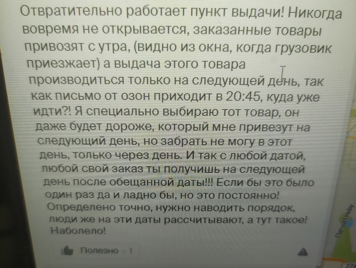 Одна дама не советует какой-то пункт по причине, что там ничего не знают и подсказать не могут. Ей не отдали посылку так как просили код, но сами не знали где его взять. Ну да конечно. Прям очень верится в это. Нет штрих-кода нет посылки. Где искать его Вы должны знать изначально. Пользуясь торговой площадкой озон вы ставите галочку, что ознакомились с правилами. В Приложении есть вся нужная информация. Скорее всего дело обстояло так. Данная клиентка наверное пришла сообщив,что она за комплектом полотенец например. На что ей ответили что нужно предоставить штрих-код. И тут началось. У меня такое было каждую смену. Им просто лень искать этот штрих-код. И даже когда объясняешь человеку где его найти, он будет скандалить с час и потом может быть его покажет. Но чаще всего он разворачивается с криками, что будет жаловаться. Хлопает дверью и бежит тебя обматерив. Обзывают обязательно уже на улице, чтобы наверняка успеть убежать.