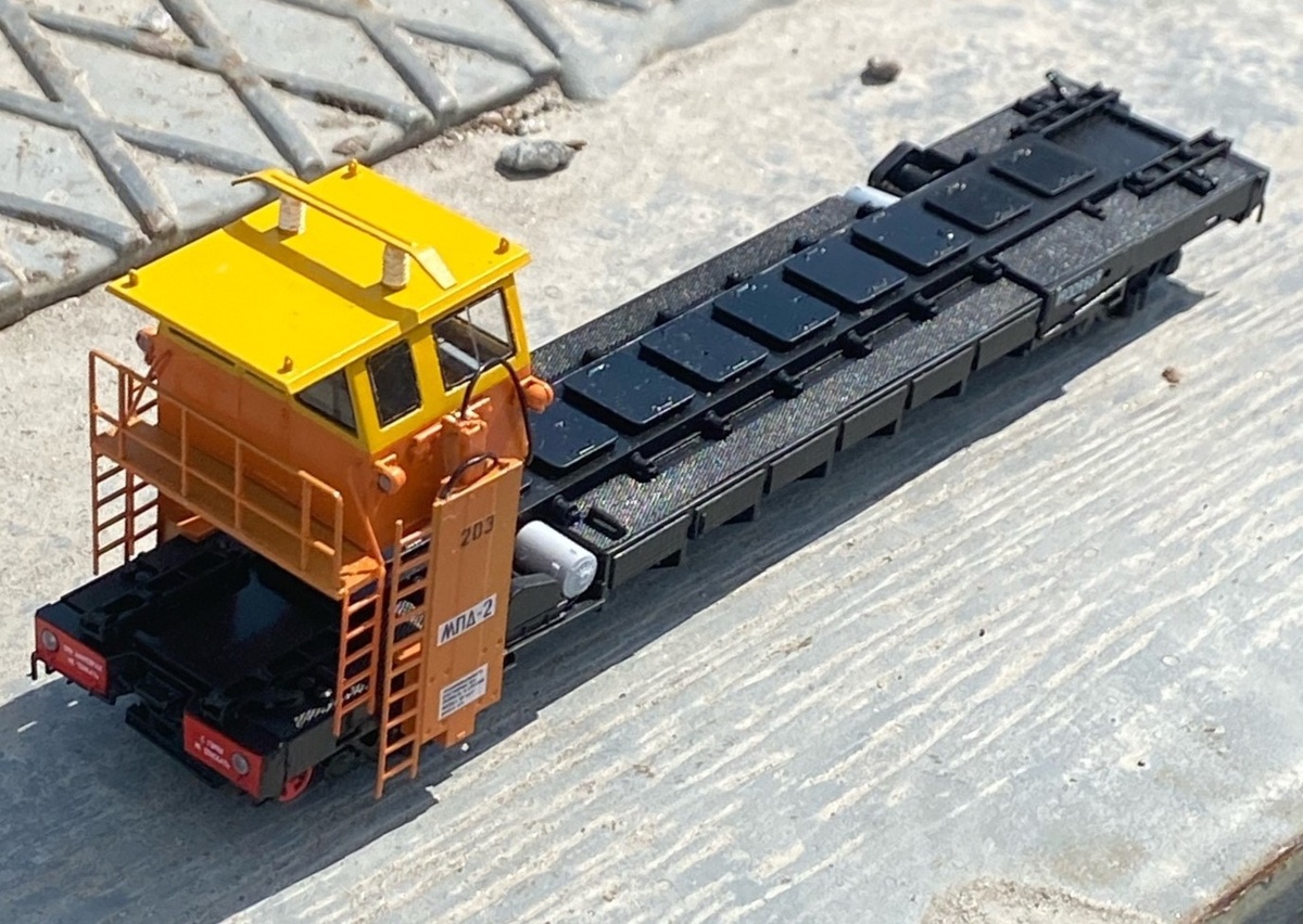 КЗТМ (Клинский завод тяжелых машин), производитель моделей вагонов и железнодорожной спецтехники в масштабе 1:87 представил анонсированную ранее модель самоходной моторной платформы МПД-2. МПД-2 - самоходная моторная платформа, которая применяется при ремонте, реконструкции и строительстве железнодорожного пути колеи 1435 и 1520 мм. Машина предназначена для выполнения различных маневровых работ при укладке нового или разборке старого железнодорожного полотна, а также на звеносборочной базе. МПД-2 может служить тяговой единицей путеукладочного поезда массой до 720 тонн и способна перетягивать пакеты рельсовых звеньев с железобетонными или деревянными шпалами и рельсами по оборудованным роликовыми транспортерами платформам к укладочному крану и от разборочного крана. Машина оснащена механизированной системой растяжки тягового троса по составу питающих платформ. Две дизель-электростанции мощностью 120 кВт каждая обеспечивают надежную работу механизмов МПД-2. Управление движением и выполне
