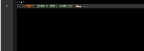 После команды init прописываются нужные вам команды. Так же от команды должен быть отступ в 4 пробела, но это не значит что надо делать 4 пробела в каждой строке.