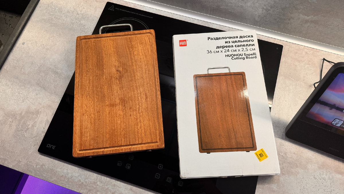 Разделочная доска Huohou Cutting Board HU0252 в такой упаковке, что ее можно даже преподнести как подарок, к примеру на новоселье. Я купил самую маленькую есть размеры побольше. Эта доска крута тем, что: Древесина сапелли идеально подходит для разделочных досок: прочная, надежная и сделанная из цельного куска. Из одного ствола можно создать всего две доски, что делает производство особенно ответственным. Использовать можно обе стороны доски, одна из них имеет канавку. Доска без трещин и зазоров, поэтому ее легко мыть, и она безопасна для здоровья. Для долговечности покрыта органическим маслом, чтобы грязь не попадала в поры. Покупал я ее на Яндекс Маркет: https://ya.cc/m/gjvbYO6