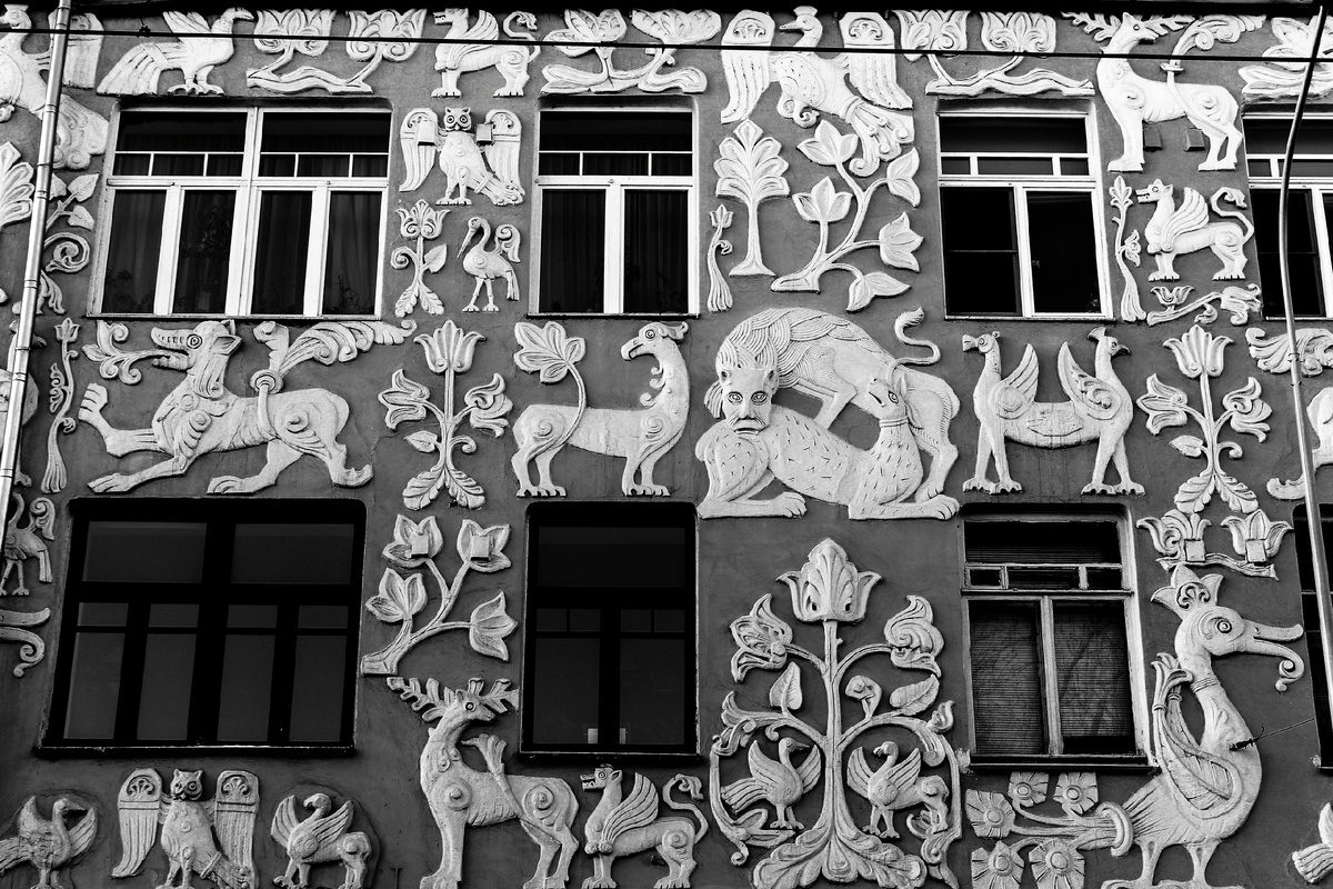 "Дом со зверями" на Чистопрудном бульваре 14, бывший доходный дом церкви Св Троицы ,по проекту Сергея Ивановича Вашкова. Чёрно-белые фото фрагментов декора дома. Автор @darzharova. Продолжение следует