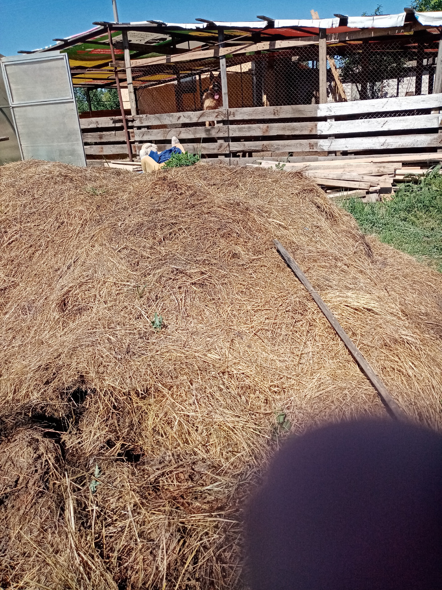 После очистки загона на участке образовались три кучи сена. (Садовые эстеты наверняка ужаснулись бы, увидев эту "красоту") . Но органика в таком большом количестве, просто выброшенная на свалку, не давала мне покоя. Жадная я до хорошего перегноя. А козья подстилка очень быстро переходит в состояние, пригодное для использования. К тому же мы её щедро удобряем сывороткой. Поэтому было принято решение использовать опыт зарубежных садоводов, сделав очень умный и серьёзный вид для любопытствующих - это не кучи сена посреди огорода, а hugelkultur, на минуточку. Hugelkultur — это насыпные грядки высотой до 1,5 метров. Они являются аналогом высоких грядок, только не в виде привычных коробов, а в виде холмов. Такие грядки удерживают влагу, увеличивают плодородие, увеличивают объем поверхности и являются отличным местом для выращивания фруктов, овощей и трав. Hugelkultur, произносится как Hoo-gul-culture, означает холмистую культуру или холм. Такие грядки позволяют утилизировать древесную