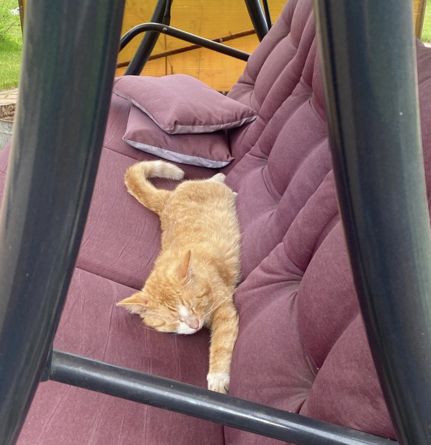 Знакомьтесь, это - Рыжик. Хотя, често говоря, понятия не имею, как на самом деле зовут этого кота. Но он приходит к нам и чувствует себя как дома. Поэтому приходится к нему как - то обращаться. По очевидным причинам называем его Рыжиком. Но надо сказать, на "Кис - кис" он отзывается гораздо охотнее. Чей это кот - мы до сих пор так и не вычислили. Но у нас ему нравится. И вот я задалась вопросом: Хорошо иметь такой характер как у Рыжика или не очень? Сейчас расскажу о нем чуть больше. Он ничего не боится, просто тотальный равнодушный пофигист. То, что он тусуется у нас на участке, дрыхнет на нашем столе и балдеет на качелях - вроде как пойдет. Мы любим котов, особенно дружелюбных, кто не обижает нашу кошку. Так вот, Рыжик не обижает. Если вглядеться в его морду, то не возникнет никаких сомнений относительно его намерений. Иногда создается впечатление, что он умеет получать удовольствие от жизни как никто другой и " не парится" ни о чем на свете. Не обижает и не обижается. Не скрою, быва