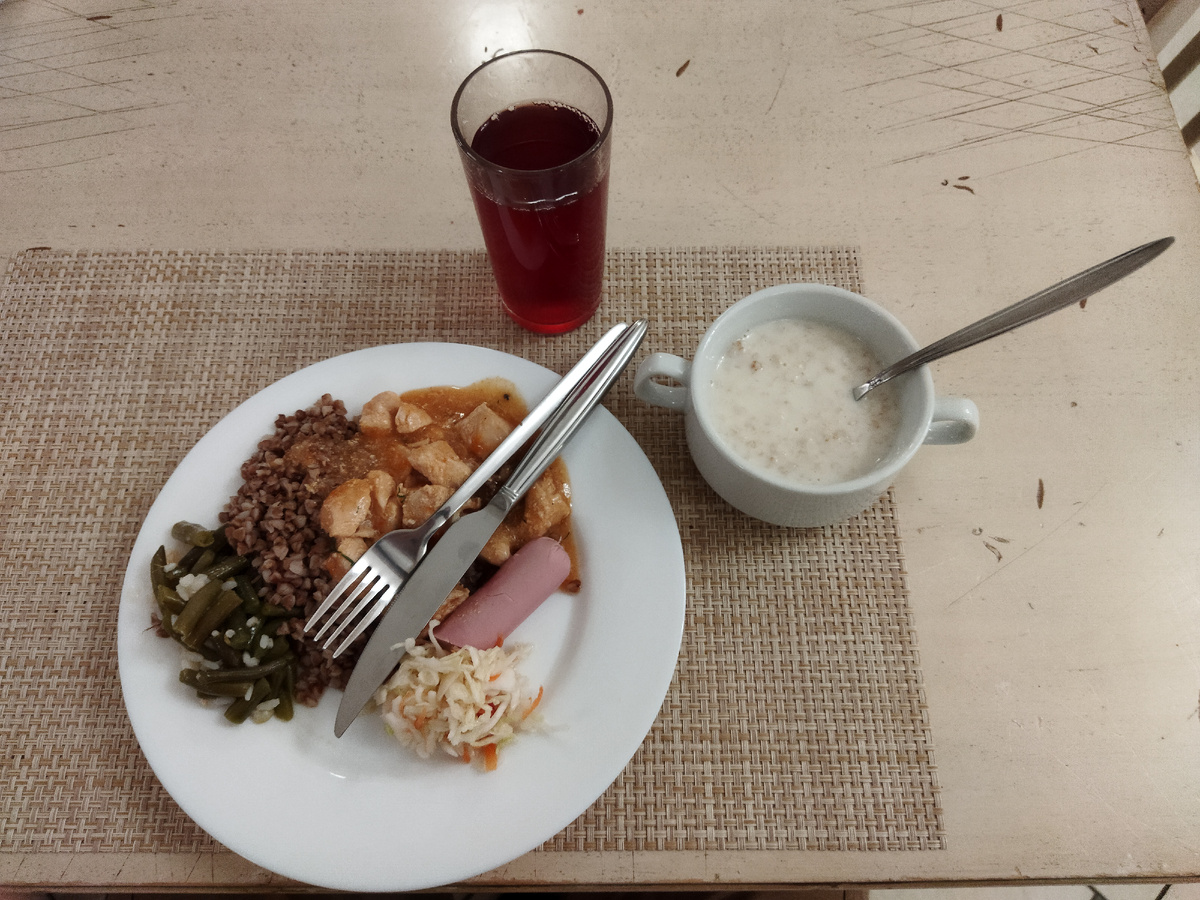 Моя еда на завтрак. Как всегда, после съедения первой порции дополнительно взял творог с вареньем.