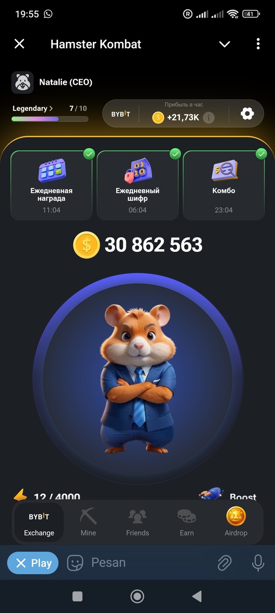 Или активный хомяк и пассивный доход? Пока не знаю. Ходят слухи, что доход от хомяка возможен. Я зарегистрировалась, получаю пассив, ввожу ежедневные шифры, собираю карточки для ежедневных комбо. Сейчас у меня там чуть больше 30 млн. Завела криптокошелëк - предполагается, что туда будут начислены какие-то криптоденьги, когда контора-разработчик выйдет в люди. Конечно, будет определëнный коэффициент, по которому рассчитают прибыль участников проекта. А ещё пишут, что регестрироваться и тапать надо до эйрдропа, потом будет поздно рассчитывать на доход от хомяка. Достаточно раз в день открывать карты и получать подарок от игры. Ну, и сразу там же завести криптокошелëк, чтобы потом участвовать в раздаче реальных денег.