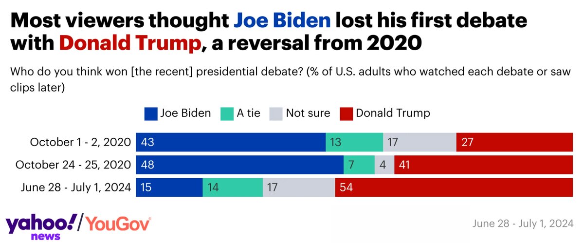 Дебаты в США между Байденом и Трампом стали самым обсуждаемым событием последних дней. В первую очередь, многие американцы были неприятно удивлены текущей "формой" действующего президента США Джо Байдена. Ниже представлена публикация с сайта Yahoo News, посвящённая этому событию (под статьёй оставлено более 18 тысяч комментариев!): "Новый опрос Yahoo News/YouGov подтверждает то, что почувствовало большинство зрителей после президентских дебатов в прошлый четверг: это был катастрофический вечер для 81-летнего президента Байдена , который выглядел неуверенно, звучал больным, запинался и в какой-то момент полностью потерял ход мыслей. Например, целых 60% американцев теперь говорят, что Байден «не годен для того, чтобы служить еще один срок в качестве президента». Только 24% говорят, что он годен. Рейтинг пригодности президента был таким низким только один раз, в ноябре 2023 года. Нет никакого приукрашивания цифр дебатов Байдена. Примерно трое из четырех американцев (74%) говорят, что они