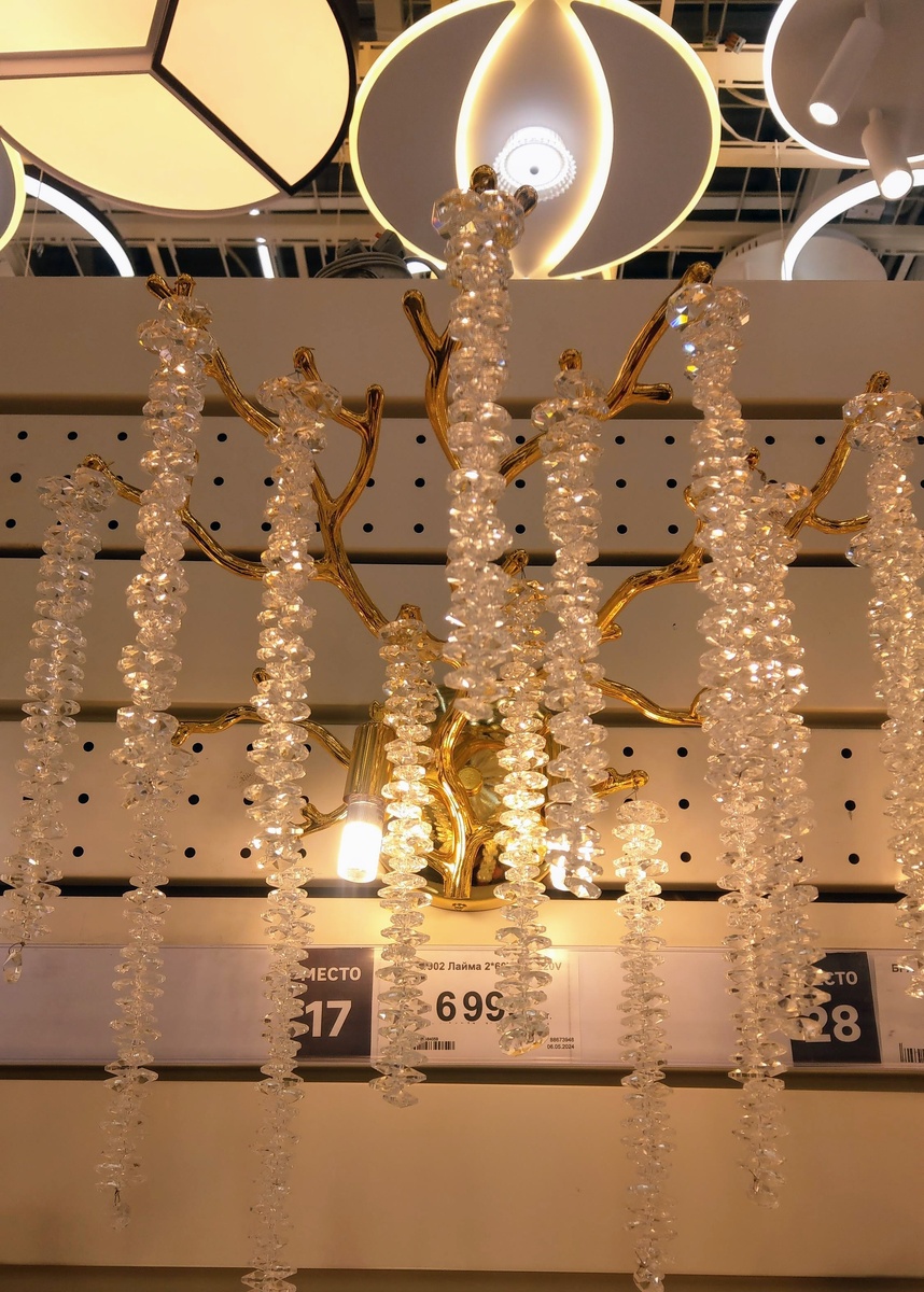 Пока искала ссылку на люстру на сайте Леруа, нашла удивительное. Бра от бренда Chiaro c огромной скидкой. Несмотря на то, что этот хрусталь производят в Китае, но торговая марка зарегистрирована в Германии, стандарты тоже европейские, поэтому товар очень качественный, дизайн очень достойный и интересный, хрусталь какой-то своей запатентованной формулы. Люстры Chiaro зачастую по 100- 200 тыс. рублей стоят.