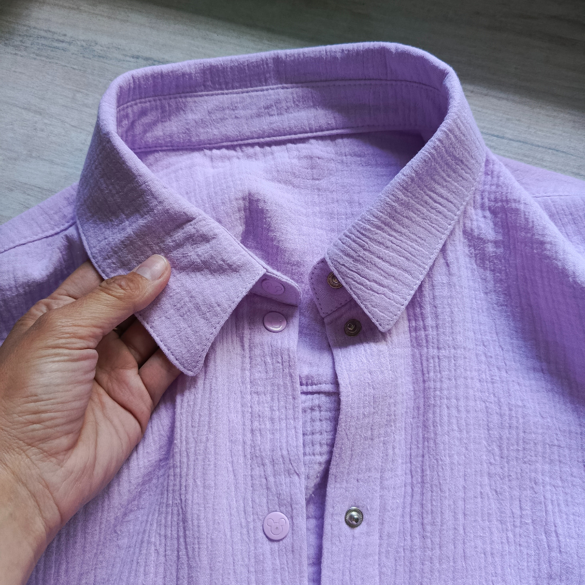 Давно хотела себе такую рубашку. Ткань аж в прошлом году купила, а сшить так и не собралась. А тут решила к шортам в комплект всё-таки сделать. Пересмотрела кучу выкроек и в итоге остановилась на рубашке "Fame"от Элины Патыковой. Честно, даже не знаю почему. Ещё на "Шкатулке" рубашка понравилась и "Мама шила малышу". Сшила её ещё вчера ночью. К утру оставалось доделать воротник и манжеты. Их делала днём - урывками. Рубашку шила второй раз в жизни. Первый раз шила для знакомого мальчика в далёком 2016 году. Впервые обрабатывала рукава таким образом (точнее, манжет): На удивление получилось без косяков. Сшила я рубашку и оказалось, что нет у меня нужных кнопок. Всё, что есть - всё не то. Пришлось прошерстить Ozon и знакомые он-лайн магазины. И нашла то, что нужно. Вчера заказала, сегодня сгоняла и забрала заказ. Кнопки подошли идеально и по цвету, и по размеру. Приехала домой и сразу к прессу: Теперь можно и готовую рубашку показать: Ну и на мне: Она идеальная: лёгкая воздушная! А цвет
