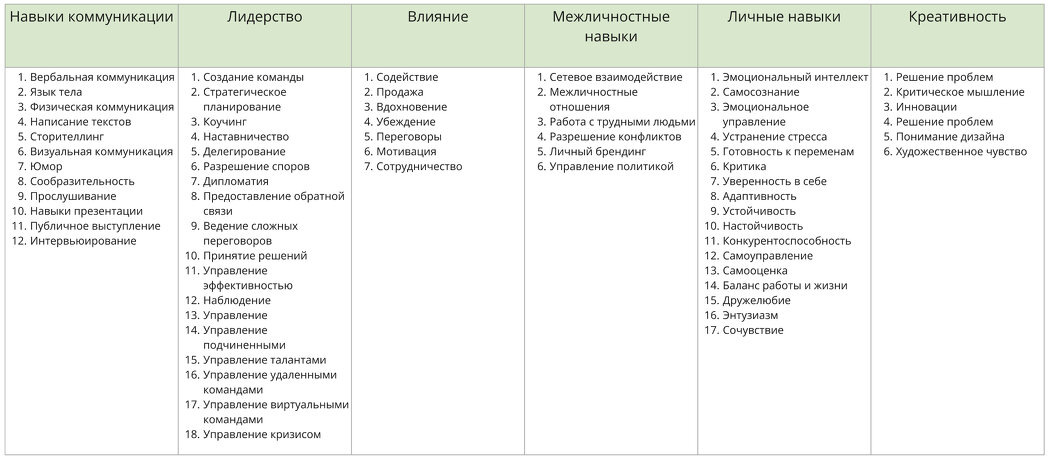 В последние годы термин "софт скиллы" стал очень популярным в профессиональной среде. Со всех сторон слышны разговоры о важности развития этих навыков, их значении для карьерного роста и успеха в любой сфере. И я не буду исключением и также отмечу, что тренд на развитые мягкие навыки не спадет, пока будет идти прогресс в технологической сфере (читать как "никогда не спадет") Но что же такое софт скиллы и почему они действительно так важны? Софт скиллы (или "мягкие навыки") - это межличностные навыки и личные качества, которые помогают эффективно взаимодействовать с другими людьми и успешно выполнять свои профессиональные обязанности. В отличие от хард скиллов (жёстких навыков), которые включают специфические технические знания и умения, софт скиллы связаны с поведением, отношением и способностью к адаптации. Многие ошибочно считают, что мягкие навыки это только про общение, но на самом деле их намного больше: К основным софт скиллам относятся: Почему все помешались на софт скиллах? Соф