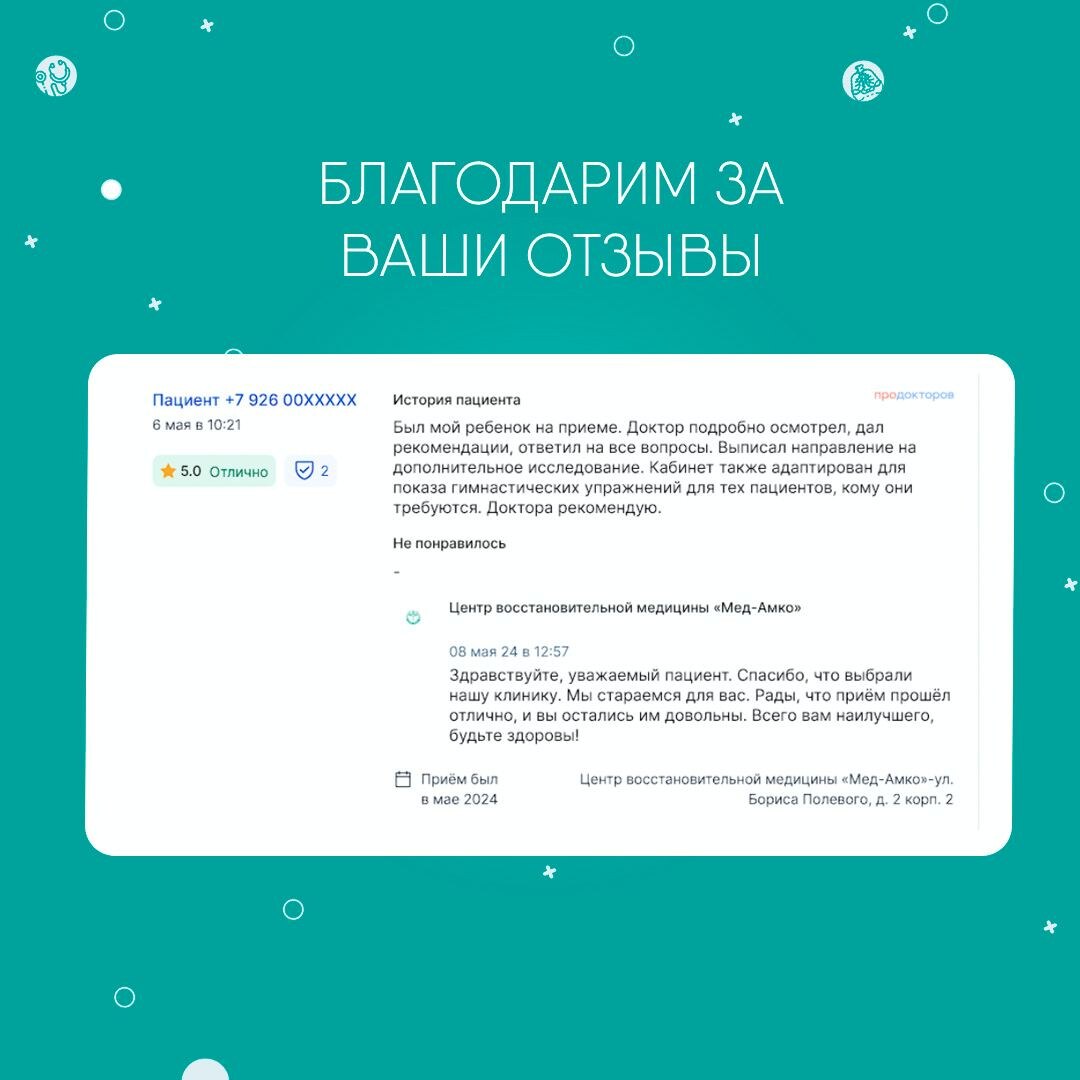 Большое спасибо за ваш отзыв! Мы рады, что ваш ребенок получил качественную и подробную консультацию. Наша команда всегда стремится к тому, чтобы каждый пациент получил максимально внимательное и профессиональное обслуживание. Мы гордимся тем, что наш кабинет адаптирован для показа гимнастических упражнений, и рады, что это было полезно для вашего ребенка. Ваши рекомендации очень важны для нас. Благодарим за доверие и желаем здоровья вашему ребенку!