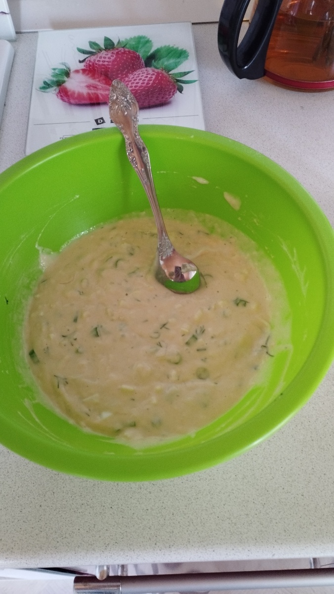 По просьбе пишу рецепт оладий с зелёным луком и яйцом. Рецепт простой. Кефир гасим содой и добавляем последовательно все ингредиенты,тщательно размешивая: 2 яйца,соль,сахар + начинка лук и 2 варёных яйца. В конце добавляю понемногу муку. Тесто должно быть густое так,что бы с ложки сползало очень лениво,а лучше столкнуть его с ложки. Вот такой густоты должно быть тесто У меня в рецепте три вида муки и количество ее небольшое,т.к кокосовая мука очень гигроскопична. Если готовить из пшеничной муки,то её уйдет больше! Расклад такой: Масло подсолнечное для жарки. Оладьи получаются пышные Готовьте и кушайте за милую душу! Пока. Всем Мира и Добра !
