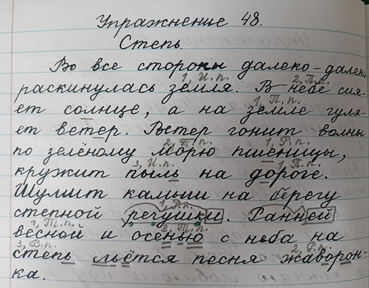 1. Проверка домашнего задания. 2. Объявление темы урока. Актуализация знаний. Сегодня мы будем упражняться в определении склонений и падежей имен существительных. 3. Работа над темой урока. Упражнение 48. Прочитайте текст "Степь". Запишем текст под диктовку. После написания диктанта дети проверяют себя по учебнику. Затем самостоятельно указывают склонение и падеж выделенных существительных, подчеркивают орфограммы и разбирают слово "речушки" по составу. Фронтальная проверка: Упражнение 50. Прочитайте стихотворение. Спишите стихотворение самостоятельно, выделите орфограммы в словарных словах, приставку на- и предлог НА. Укажите склонения и падежи имен существительных. Проверка: 4. Домашнее задание. Упражнение 51.