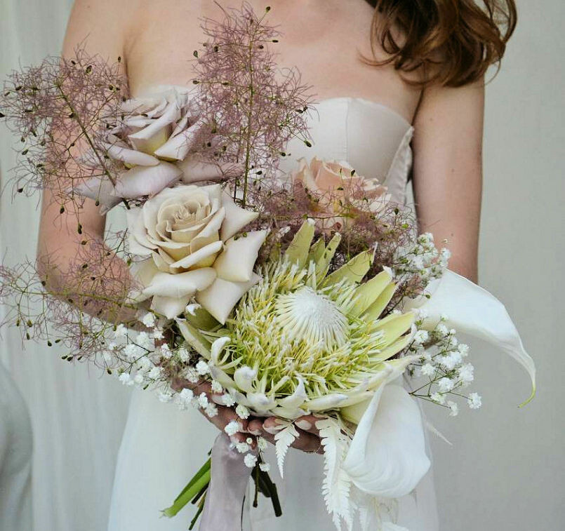 Цветок протея имеет уникальную форму, напоминающую пламя или птицу в полете. Его сочные лепестки окрашены в яркие оттенки, такие как оранжевый, розовый, красный и желтый, что делает его идеальным для использования в букетах цветочных.