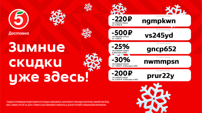 - Промокод Пятёрочка Доставка - скидка 200 р. от 2000 руб. для повторных заказов в Москве и Московской области!