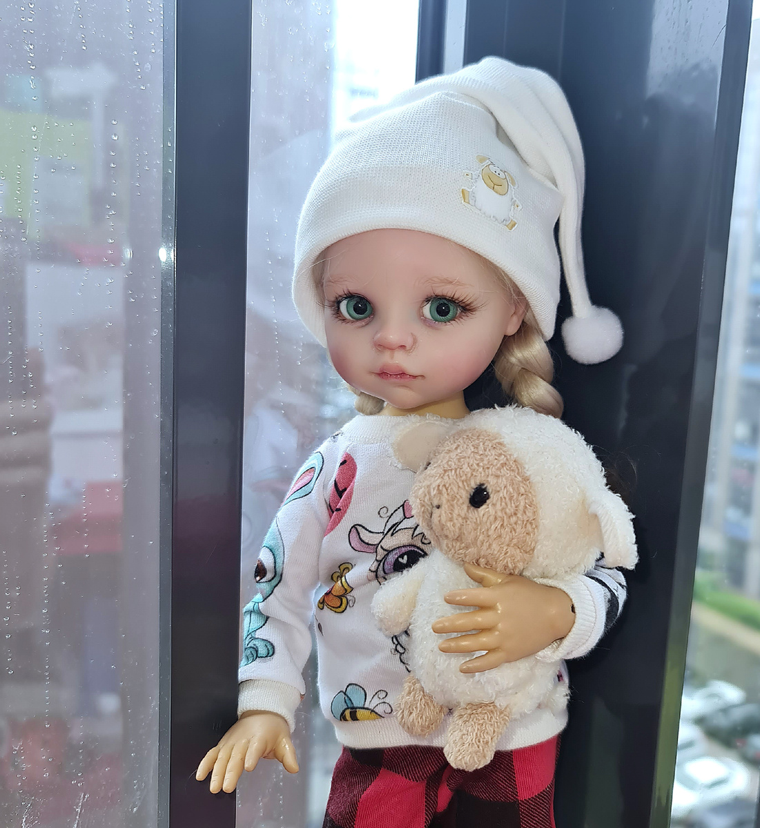 Наконец-то "ветер переменился". Жара ушла, повеяло свежестью, полил такой желанный в эти дни мелкий дождик. Плюс тридцать в Питере переносится очень плохо: из дома идти никуда не хочется, а в доме сидеть и работать не можется. Марьяшка с утра первой услышала стук капель дождя и сбежала на балкон. Теперь можно сколько хочешь смотреть из окна: жестокое солнце не страшно для винила. -Куда это ты, Марьяша, собралась с утра пораньше да ещё и в пижаме? -Гулять. Смотри, дождь, пойдём на улицу! Хочу по лужам пройтись так же, как по клумбам, помнишь? -Да я-то помню, вот только сыро сейчас... Марьяша даже не дала мне закончить: -Да я вот уже и ботинки надела! -А куртка? -И куртка есть! Мы с овечкой готовы! -Ну как? -Всё равно вымокнешь. Причёска испортится. -А так? Капюшончик-то моего размера, даже с причёской хорошо, дождь не страшен! -Нет, не пойдёт... Дай-ка подумаю... Кого-то ты мне напоминаешь сейчас... -Хм... И кого же? -Вот, держи! Теперь точно она! Мэрри Поппинс, прилетевшая к детям на