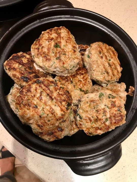 Когда делаю фарш, пропускаю через мясорубку сельдерей и кабачок. Лук режу дольками, обжариваю, и тоже в мясорубку. Рублю зелень, а чеснок - через давилку. Если есть аджика, добавьте в фарш. Солим по вкусу. Фарш получается жидковатым. Добавляем овсяные отруби, неполную горсточку. Теперь очередь взбитого белка. Вмешиваем его постепенно, в несколько приемов. И оставляем на 5-7 минут, чтобы отруби размякли. Обжариваем. Фарш воздушный. Я просто беру порцию и кладу на сковородку, особо не формируя. Пока жарится первая порция, разогреваю духовку до 170 градусов, и готовые котлетки на несколько минут туда загружаю в огнеупорной посуде. ✔ Филе куриное – 300 г; ✔ Говядина – 150 г; ✔ Белок яичный – 4 шт.; ✔ Кабачок – 200 г; ✔ Сельдерей – 100 г; ✔ Отруби – 50 г; ✔ Лук – 100 г; ✔ Чеснок – 3 зубчика; ✔ Зелень – 50 г; ✔ Аджика – 1 ст. л.; ✔ Масло (для жарки) – 50 г; ✔ Соль, специи – по вкусу. КБЖУ на 100 г - 139/13,9/7,8/3,6. + 6 фото Рецепт на странице Автор рецепта – Галина Древина © Почтенный возр