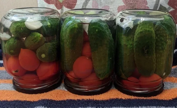 Этот маринад подходит для консервирования овощного ассорти из огурцов, помидоров, лука, перца, кабачков и патиссонов. Расчет на 1 л воды. Заливаем его второй заливкой и сразу закручиваем крышки. 1 литр воды 1,5 ст. л. соли 3 ст. л. сахара 3 лавровых листа 8 горошин черного перца 3 горошины душистого перца Банки заранее простерилизовать и наполнить овощами. Укроп и чеснок по вашему желанию. Смешать 1 л воды и остальные ингредиенты. Маринад прокипятить, влить в него 1 ч. л. уксусной эссенции (70%) и сразу залить в банку второй заливку, первую воду сливаем, она не нужна.