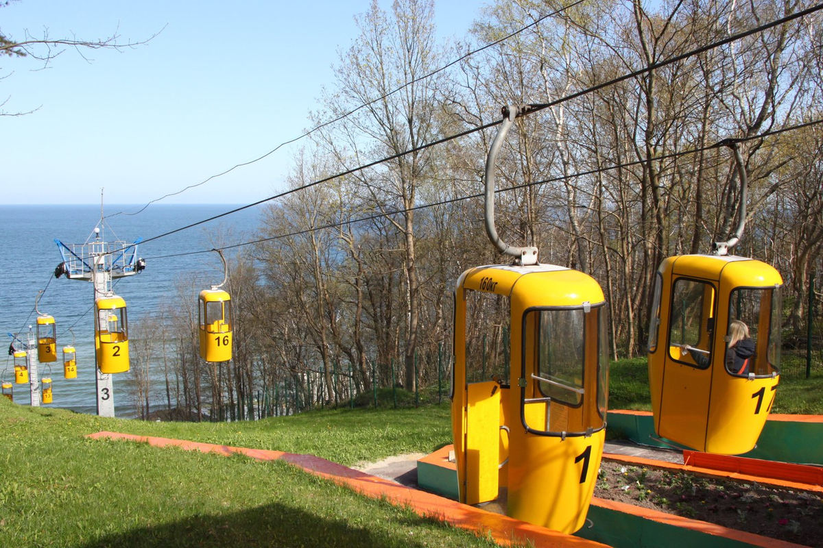 Исторический променад Светлогорска сегодня на ремонте, вдоль моря высится строй подъемных кранов, а на береговой линии установлены буны — сооружения для укрепления берегов и создания широких пляжей: сильные течения относят песок на восток, к Зеленоградску. Из верхней части города на променад можно спуститься по «парадной» лестнице — у ее подножия красуются мозаичные солнечные часы, а на промежуточных пунктах установлены удобные скамейки для отдыха. А на неокультуренный еще, вполне «дикий» участок светлогорского берега, — туда, где после шторма вполне реально отыскать выброшенный из глубин кусочек янтаря, — проще всего съездить в вагончике исторической канатной дороги — ровесницы вокзала. Есть и третий путь — в кабине импозантного современного лифта (с верхнего этажа подъемной башни открывается отличный вид на море и берег), и четвертый — по извилистым улочкам, мимо квартала курортных лавок и лавчонок с поделками из балтийского солнечного камня, который сменяют кварталы исторических вил