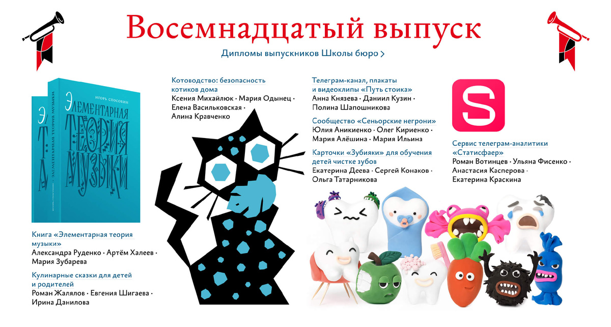 В июне был восемнадцатый выпуск Школ дизайнеров, редакторов и руководителей. На сайте бюро опубликованы дипломные проекты выпускников — продукты с клиентами и пользователями. Дипломные проекты Школы бюро — настоящие продукты, которые студенты придумывают, создают и продвигают всего за шесть недель третьей ступени школы. Правила дипломных проектов: На защите 18 выпуска студенты представили свои проекты. Карточки «Зубияки» для обучения детей чистке зубов