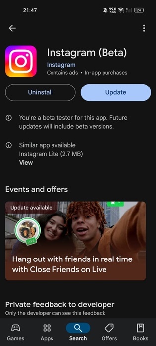 У Meta есть собственный чат-бот с искусственным интеллектом, Meta AI, который потенциально может составить конкуренцию ChatGPT. Чат-бот с искусственным интеллектом доступен во всех приложениях Meta, таких как facebook, Instagram и WhatsApp. Мы обсуждаем Meta AI, потому что он недавно стал доступен в приложении Instagram для Android и iPhone. Meta AI - это обычный чат-бот с искусственным интеллектом, но уникальность его в том, что к нему можно получить доступ непосредственно из чатов Instagram. Чат-бот с искусственным интеллектом доступен из Instagram DM и используется для генерации текста, ответов на вопросы, создания изображений и многого другого. Если вы используете приложение Instagram со своего телефона Android, вам необходимо выполнить следующие действия, чтобы использовать Meta AI. 1. Чтобы начать, обновите приложение Instagram на своем телефоне Android из магазина Google Play. 2. После обновления запустите приложение Instagram и коснитесь значка Сообщений в правом верхнем углу