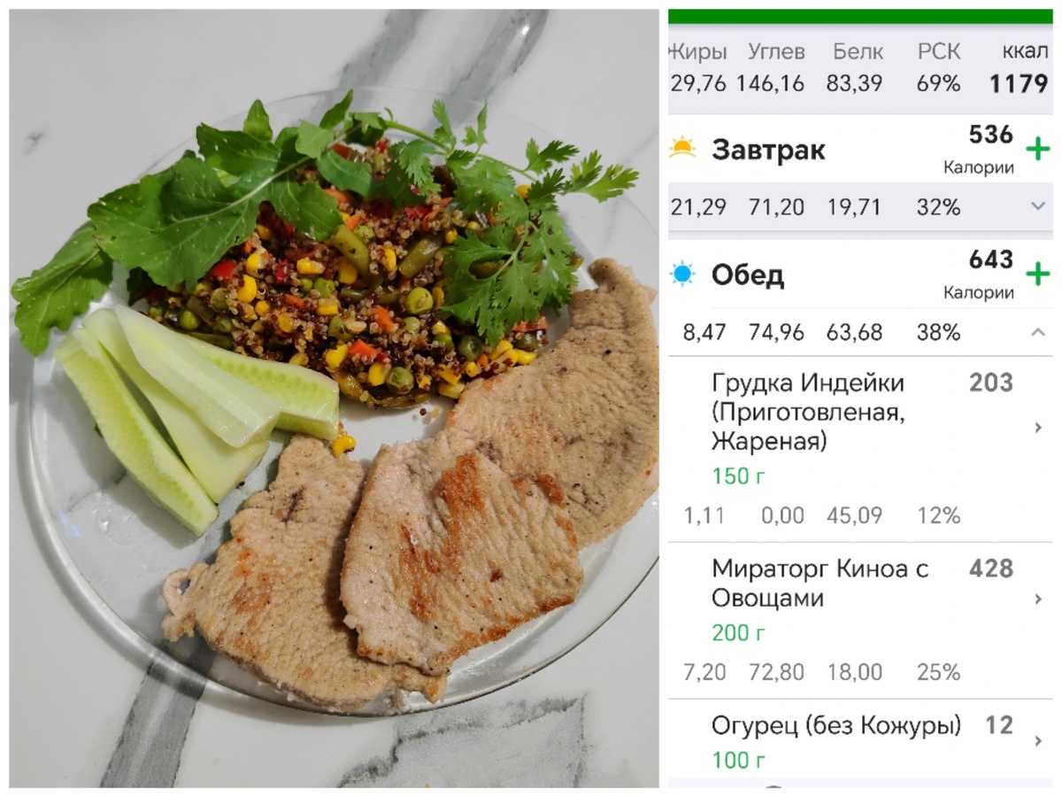 Сегодня на обед киноа с овощами, индейка, огурец.