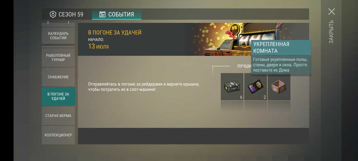 Всем привет. Как и было обещано, вслед за событием "Испытания коммуны", 13 июля начался ивент "В погоне за удачей". Возможные лучшие награды: ящики спецвойск с экипировкой и оружием, две фиолетовых карты инспектора для получения лучшего лута в полицейском участке и целая укрепленная комната с металлическими стенами, которую можно установить на домашней локации: Это событие как обычно ориентировано на новичков в игре, а также на жалкие попытки выбить донат. Для запуска события отправляюсь на заправку, где наблюдаю за ограблением владельца заправки. Его "кинули" на все крышки из слот-машины. Я вообще против такого рода автоматов и только позлорадствовал этому. Но такими принципами событие не пройдешь... Очень странно, что на всегда людной заправке не смогли справиться лишь с двумя рейдерами. Эй разрабы, где логика?! Совсем неудивительно, что владелец заправки дает мне задание выследить рейдеров и отнять часть крышек: Отправляюсь в сосновую рощу, где расправляюсь с рейдерами ( это легко