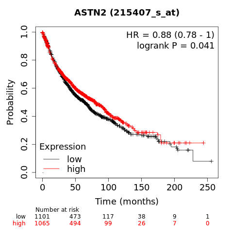 В литературе связь между ASTN2 и раком, по-видимому, недостаточно изучена, и опубликовано очень мало статей по этой теме. Однако одно исследование предположило, что ASTN2 связан с функцией легких, а другое исследование показало, что экспрессия ASTN2 повышена в клеточных линиях глиобластомы по сравнению с нормальными человеческими астроцитами.