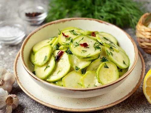 Я за то, чтобы рецепты были простыми. В большинстве случаев приготовления кабачков такой минимализм оправдывает себя, поскольку блюда выходят очень вкусными. На первый взгляд эти маринованные кружочками в сыром виде кабачки быстрого приготовления, несколько перегружены дополнительными ингредиентами. Но это только, пока вы их не попробуете. Поскольку все делается с невероятной быстротой, то многие хозяйки приспособились мариновать закуски в обычном пакете, помните, мы так делали огурцы? Всем понравилось. Возьмите: Пошаговый рецепт: Порежьте кабачки тонкими кружочками. Аналогично настрогайте луковую головку и разделите на отдельные кольца. Мелко порубите укроп. Сложите кабачки в пакет (можно использовать рукав для запекания или обычный контейнер). Прибавьте укроп с луком, аккуратно перемешайте. Заправьте солью с сахаром, красным и черным перцем. Добавьте дижонскую горчицу, влейте уксус. Раздавите прессом чесночные дольки и отправьте в закуску. Плотно завяжите пакет и аккуратно перемешайт