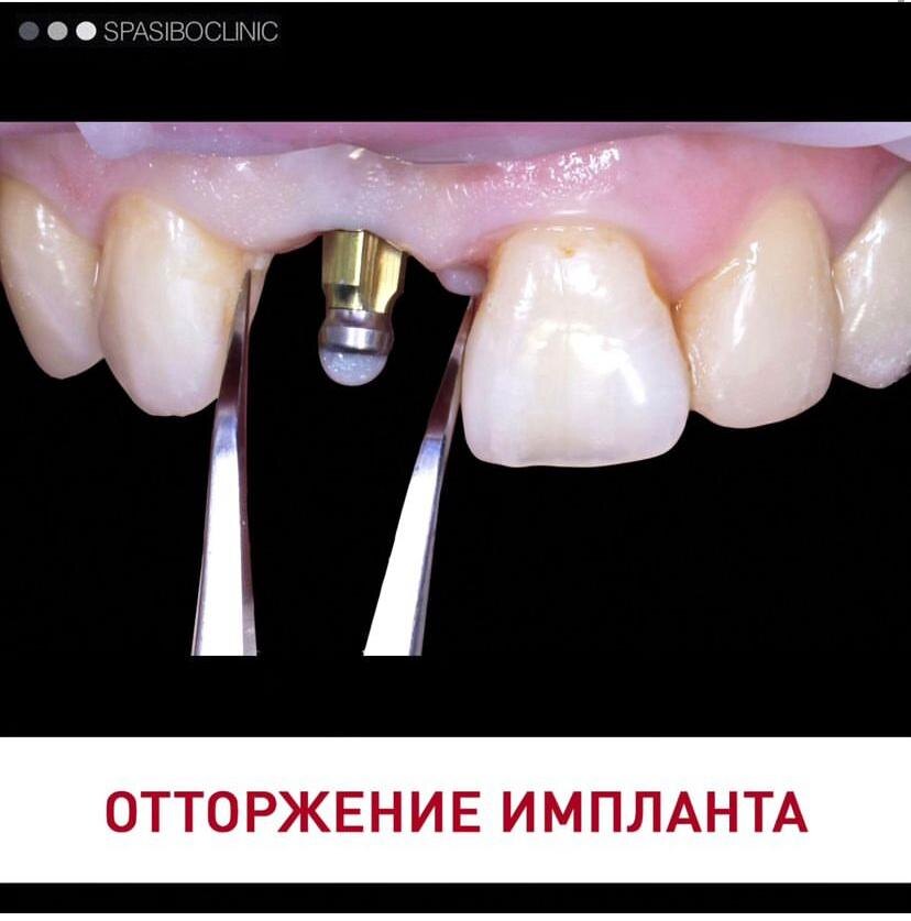 Неудачная имплантация с костной пластикой закончилась отторжением имплантата, воспалением и пластиковым мостом на месте переднего зуба.
