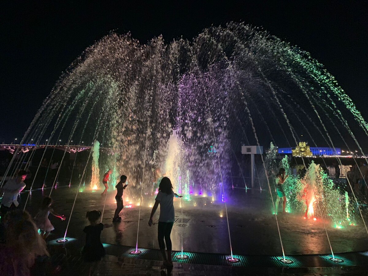 Вечер на набережной — что может быть романтичнее? Разве только вечер на Нижневолжской набережной Нижнего Новгорода у светомузыкального фонтана. С реки дует освежающий ветерок, вдали обрисовываются купола храма, на «трибунах» набережной сидят люди и с нетерпением ждут, когда заиграет музыка и в темное небо взовьются разноцветные водяные столбы. Они то падают вниз, то устремляются вверх, перекрещиваются, разлетаются миллионами брызг, и это прекрасно! Под струями радостно носятся дети: когда еще представится случай промокнуть насквозь с полного согласия родителей.