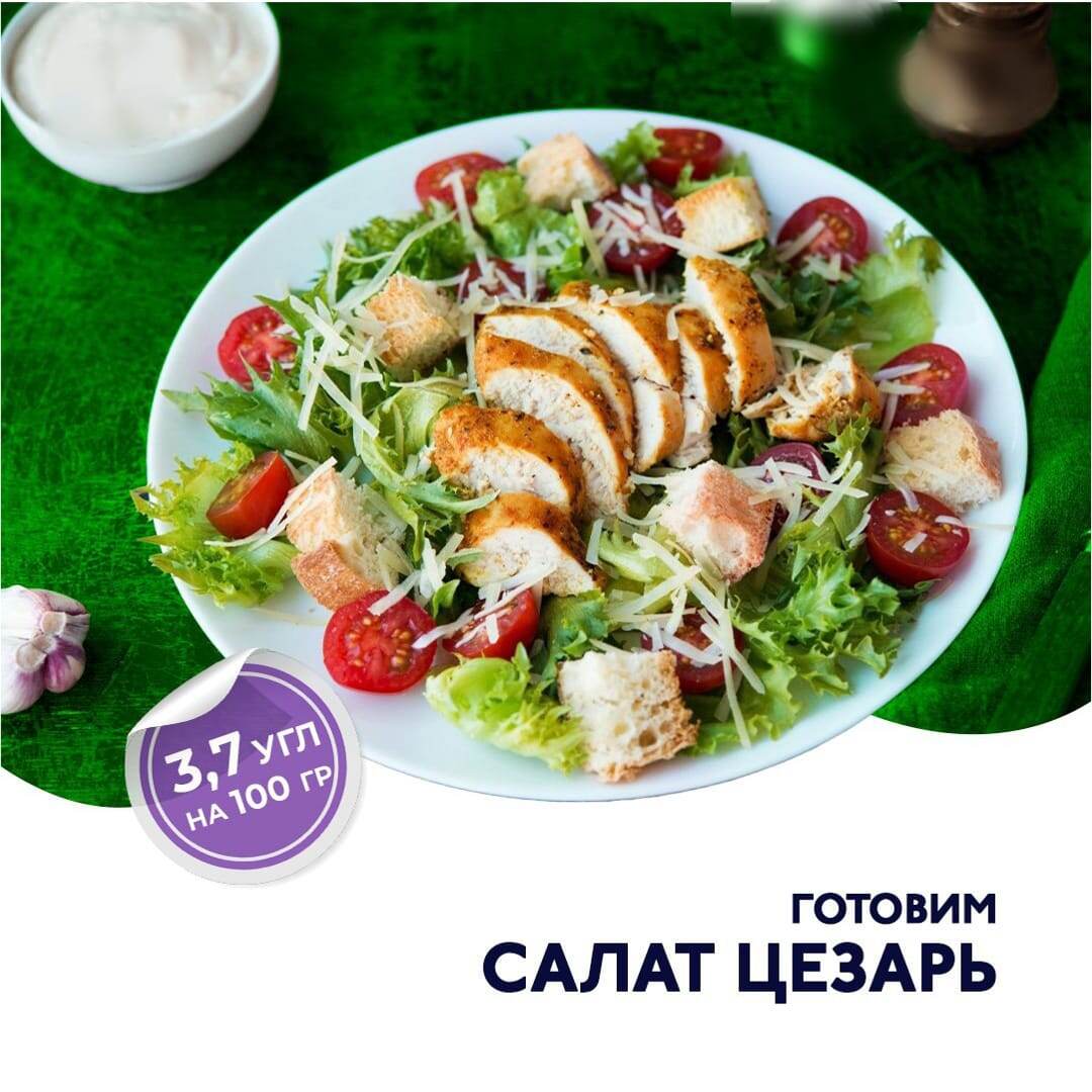 Классический салат «Цезарь» в упрощенной рецептуре — вариант всеми любимого блюда, который можно легко и быстро приготовить дома. Этот салат отличается своей сочностью, пикантностью и, конечно же, неповторимым вкусом🥗 Ингредиенты: 150 гр салата айсберг = 3 угл 150 гр томатов черри = 6 угл 40 гр белого хлеба = 17,8 угл 100 гр пармезана 300 гр куриной грудки 1 зубчик чеснока = 2 угл 70 гр греческого йогурта без добавок = 2,1 угл 10 гр горчицы зерновой = 1,2 15 мл лимонного сока 10 гр анчоусов (не обязательно, но в оригинальном рецепте они присутствуют) соль, черный перец по вкусу _____________ Итого: 32,1 угл на весь салат / 3,7 угл на 100 гр (пересчитайте в своем случае) Приготовление: 1. Куриную грудку обжарьте до готовности и золотистости, остудите и нарежьте небольшими кусочками. Салат промойте, обсушите и порвите на крупные куски. Томаты черри разрежьте пополам. Хлеб нарежьте кубиком. 2. На раскаленной сковороде подсушите кубики хлеба до золотистой корочки. 3. В маленькой миске с